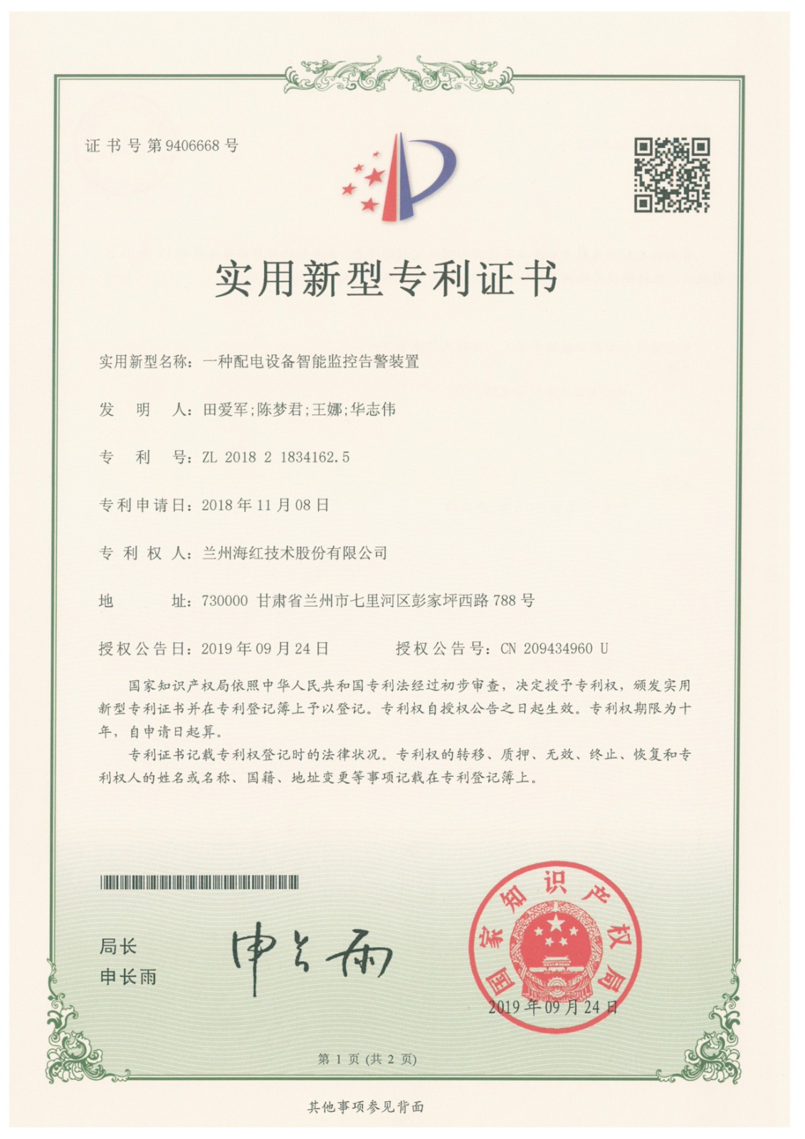 我司再次取得一項(xiàng)實(shí)用新型專利,至此我司申請(qǐng)受理專利與軟件著作權(quán)登記累積103項(xiàng),已獲得授權(quán)81項(xiàng)(其中發(fā)明專利10項(xiàng),實(shí)用新型專利59項(xiàng),軟件著作權(quán)9項(xiàng),外觀設(shè)計(jì)專利3項(xiàng))。