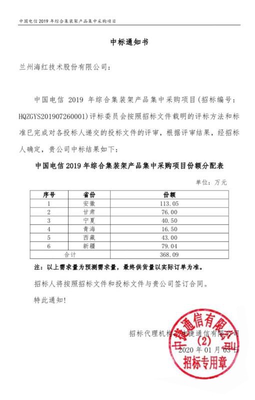 我司成功中標(biāo)“中國(guó)電信2019年綜合集裝架產(chǎn)品集中采購(gòu)”項(xiàng)目,將對(duì)我司2020年經(jīng)營(yíng)業(yè)績(jī)、市場(chǎng)拓展產(chǎn)生積極的影響。