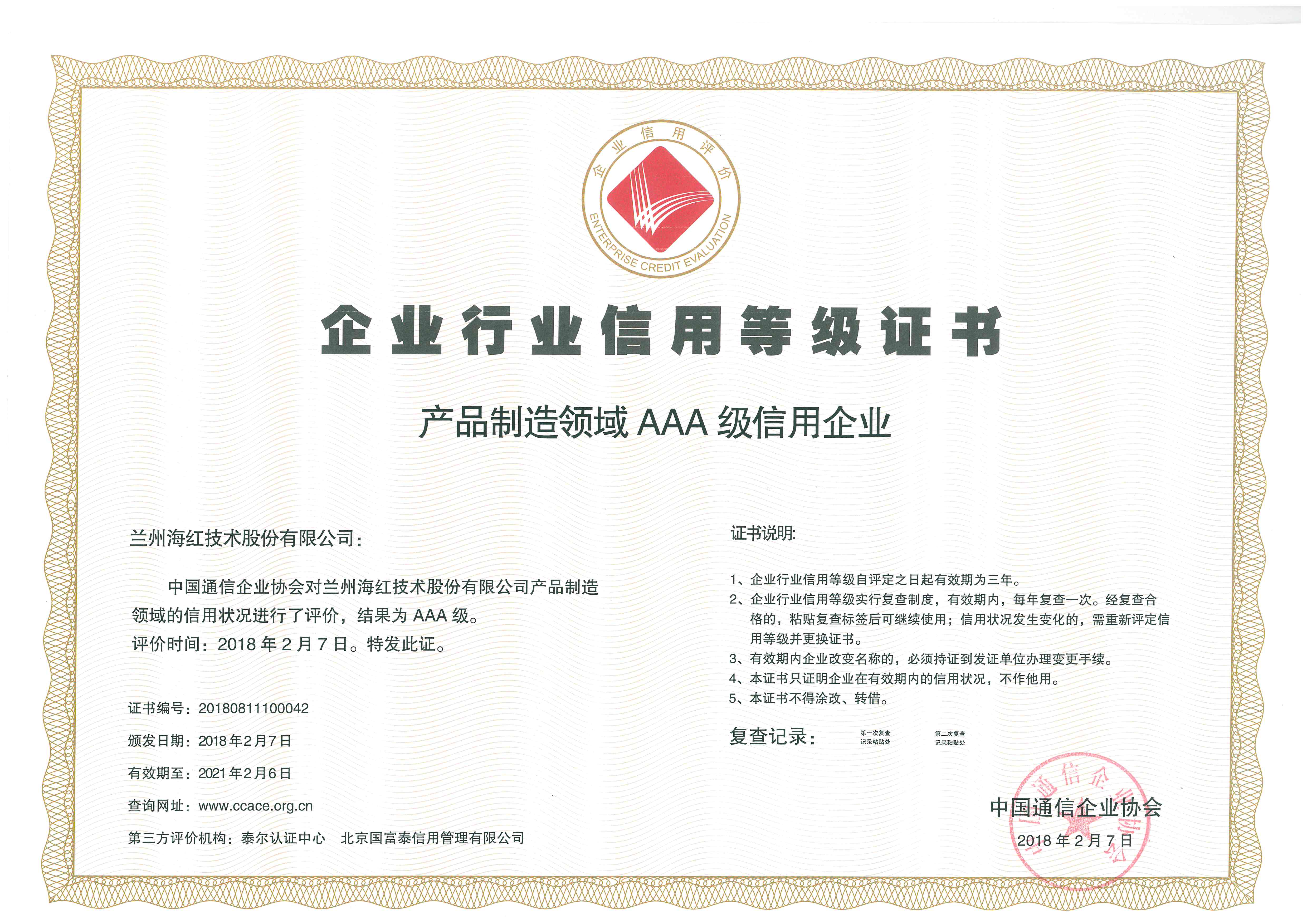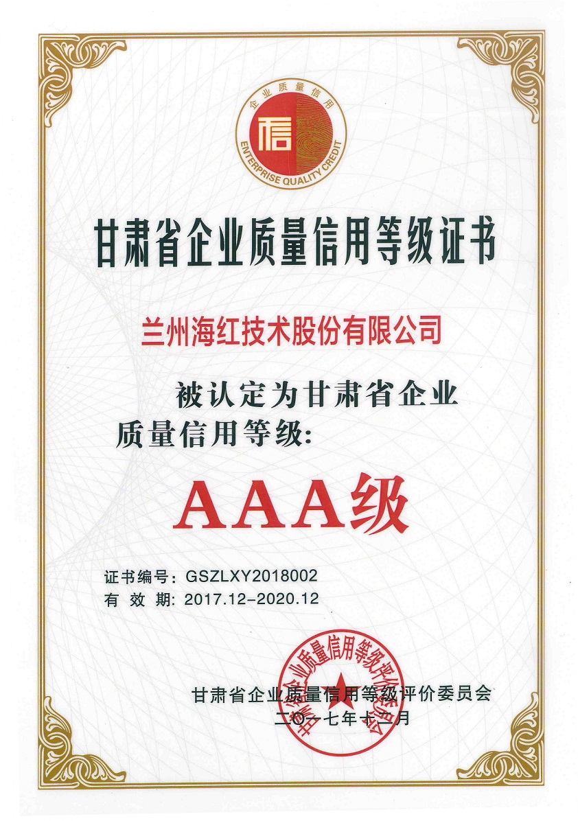 我公司被甘肅省企業(yè)質(zhì)量信用等級評價委員會認定為甘肅省企業(yè)質(zhì)量信用等級AAA級企業(yè)。