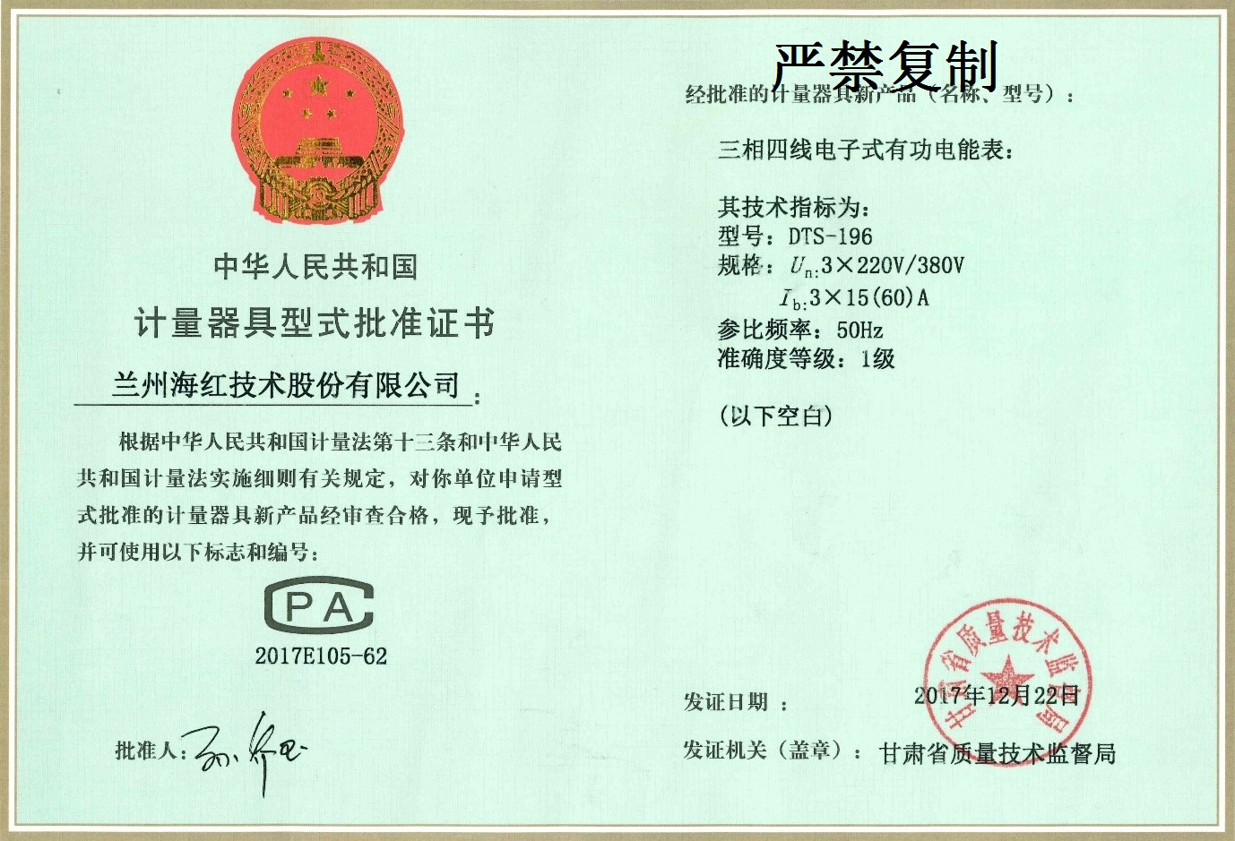 我公司生產(chǎn)制造的“三相四線電子式有功電能表”產(chǎn)品,經(jīng)甘肅省質(zhì)量技術(shù)監(jiān)督局的現(xiàn)場審核,生產(chǎn)條件、產(chǎn)品質(zhì)量和計(jì)量法制管理考核合格,通過CMC認(rèn)證,取得制造計(jì)量器具許可證。