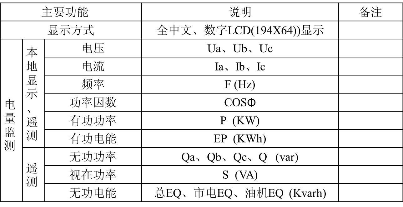 3、具有市電接入的有功電能計(jì)量、油機(jī)發(fā)電時(shí)間統(tǒng)計(jì)功能,可通過智能通信接口實(shí)現(xiàn)遠(yuǎn)程抄表。