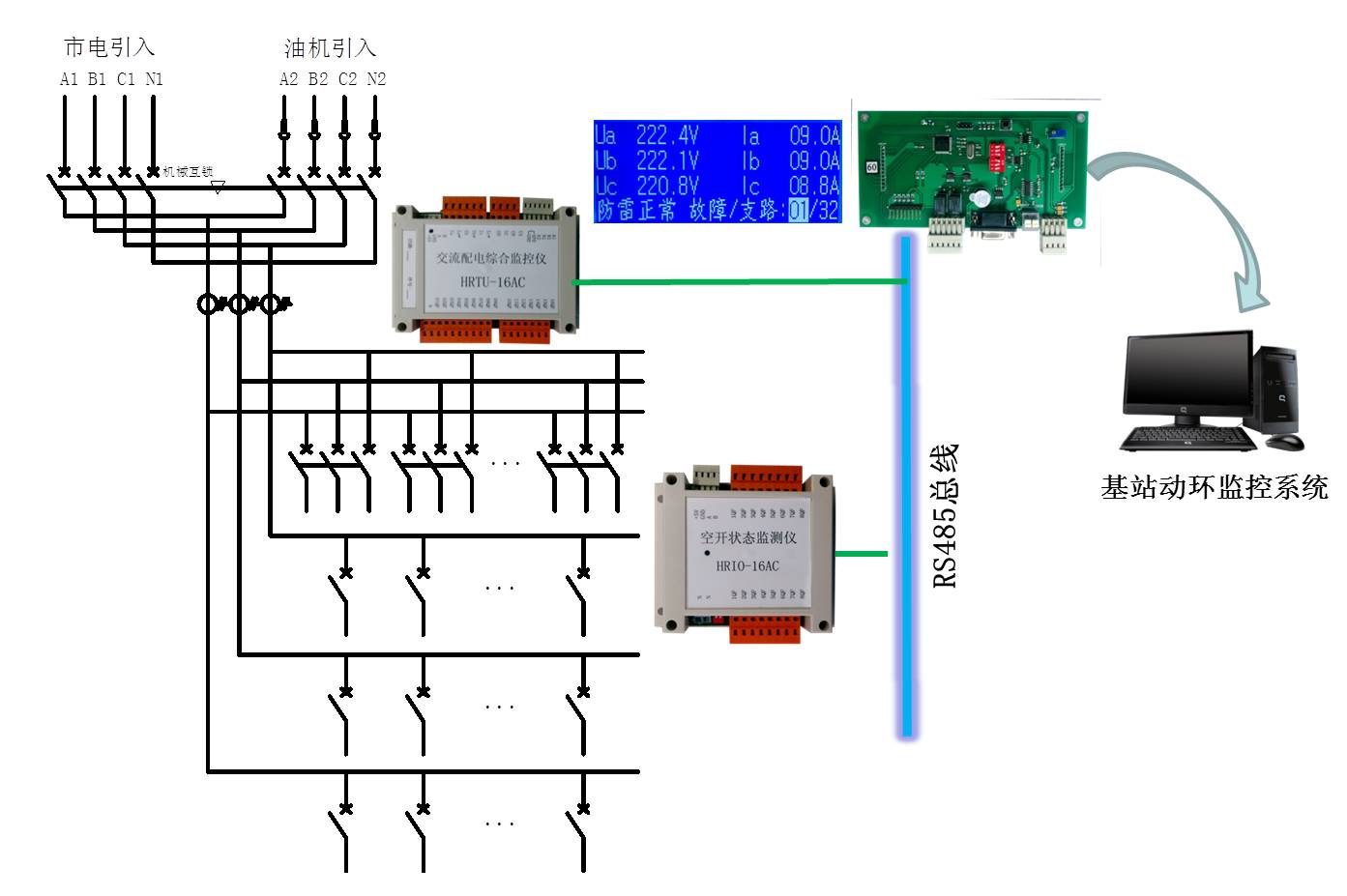 概述:此方案主要用于通信基站用交流配電防雷箱的智能監(jiān)控,對(duì)電源分配單元與防雷保護(hù)裝置進(jìn)行實(shí)時(shí)。具有市電與油機(jī)發(fā)電計(jì)量,發(fā)電時(shí)間累計(jì),各配出支路負(fù)載設(shè)備運(yùn)行監(jiān)控等功能。具備RS-485、RS-422、RS-232、以太網(wǎng)四種通信接口,可上傳數(shù)據(jù)到基站動(dòng)環(huán)監(jiān)控系統(tǒng),實(shí)現(xiàn)基站集中管理。方便用戶全面了解掌握基站交流電源及負(fù)載設(shè)備運(yùn)行情況;方便發(fā)電業(yè)務(wù)的管理考核;并為基站能耗管理、節(jié)能減排提供全面可靠的分析數(shù)據(jù)。